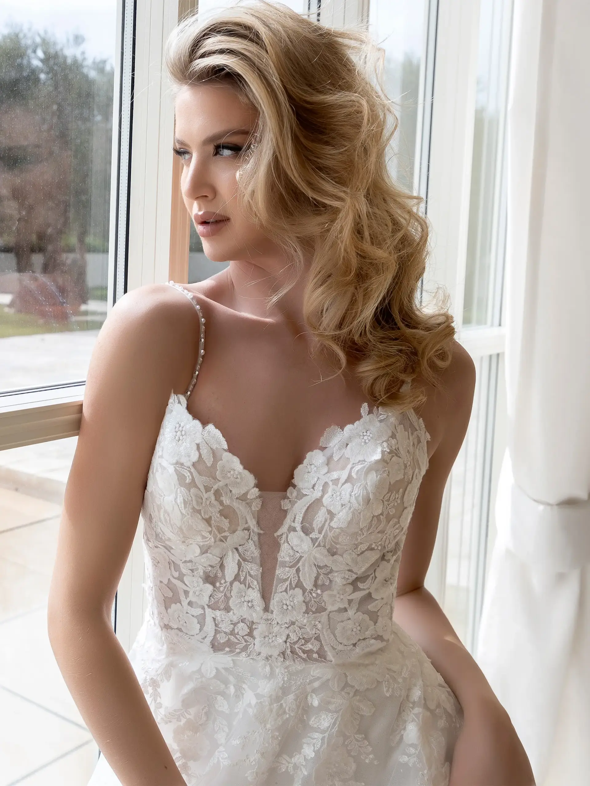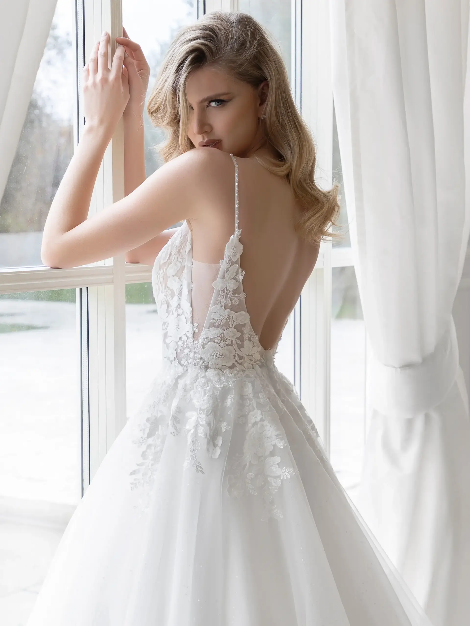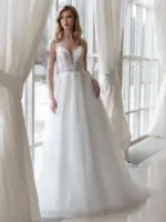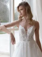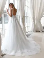 Abito romantico in pizzo ricamato tulle e glitter linea A corpetto scollatura a cuore e scollatura a V dietro