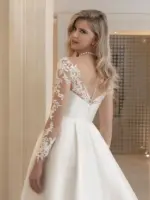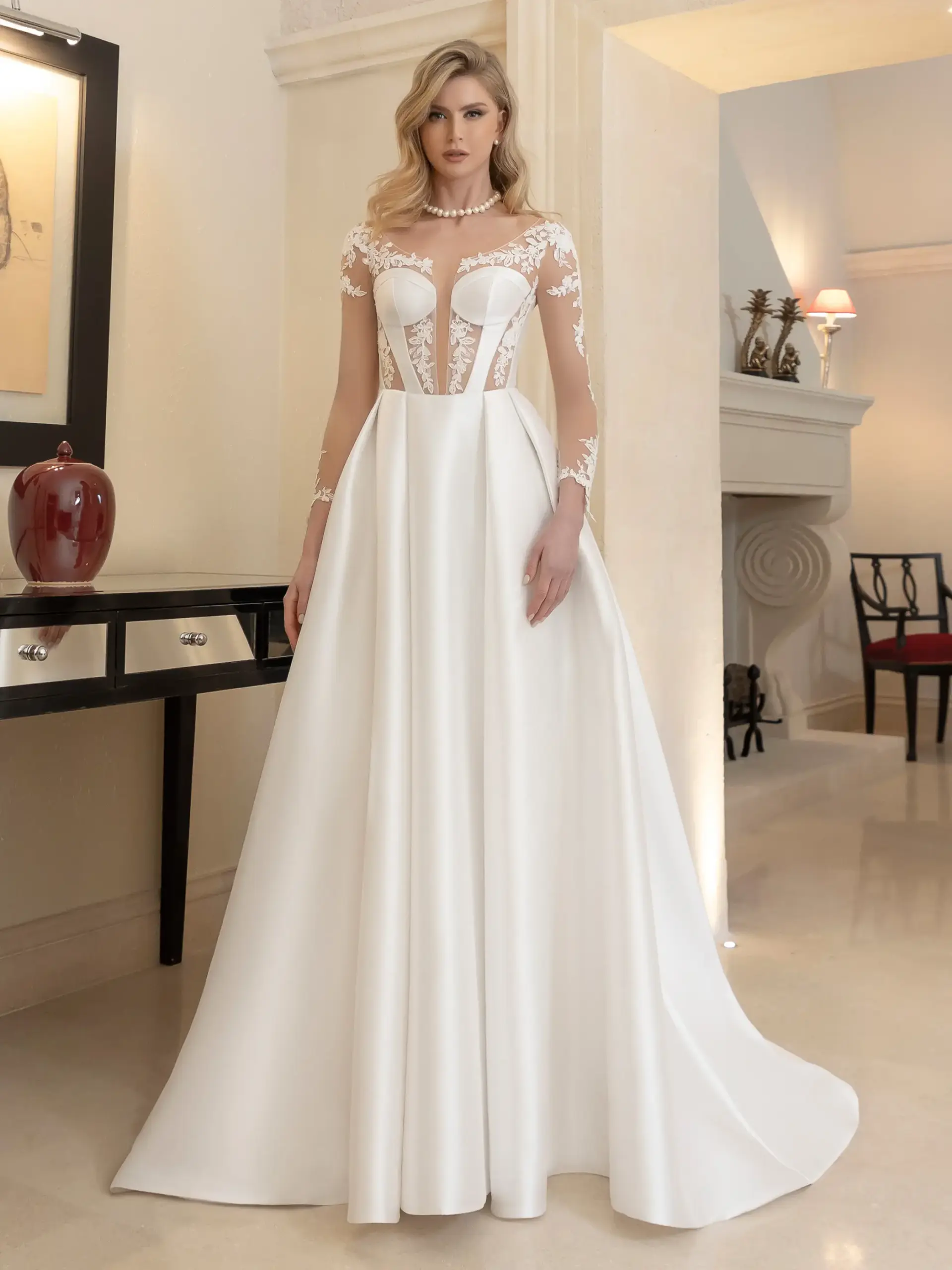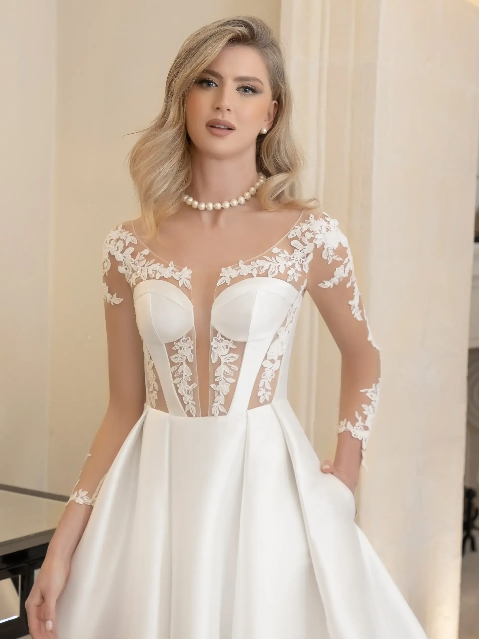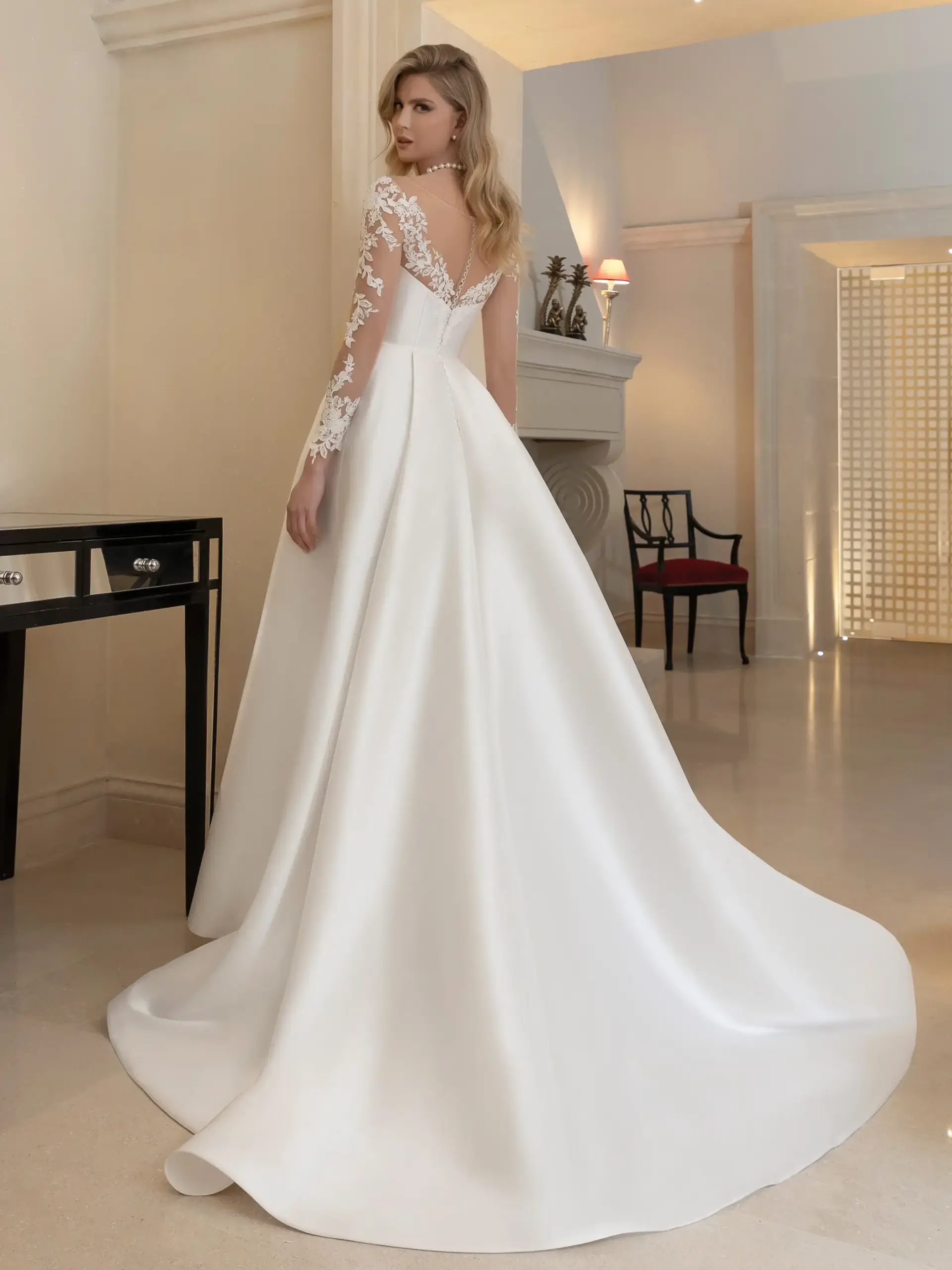 Abito romantico in Mikado con corpetto pizzo ricamato e coda rotonda