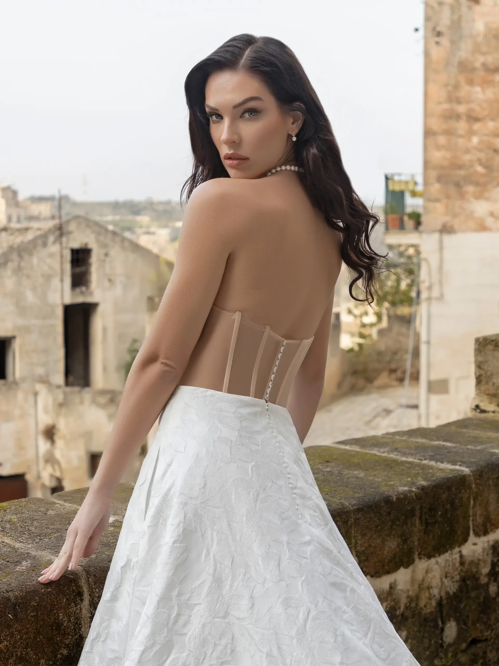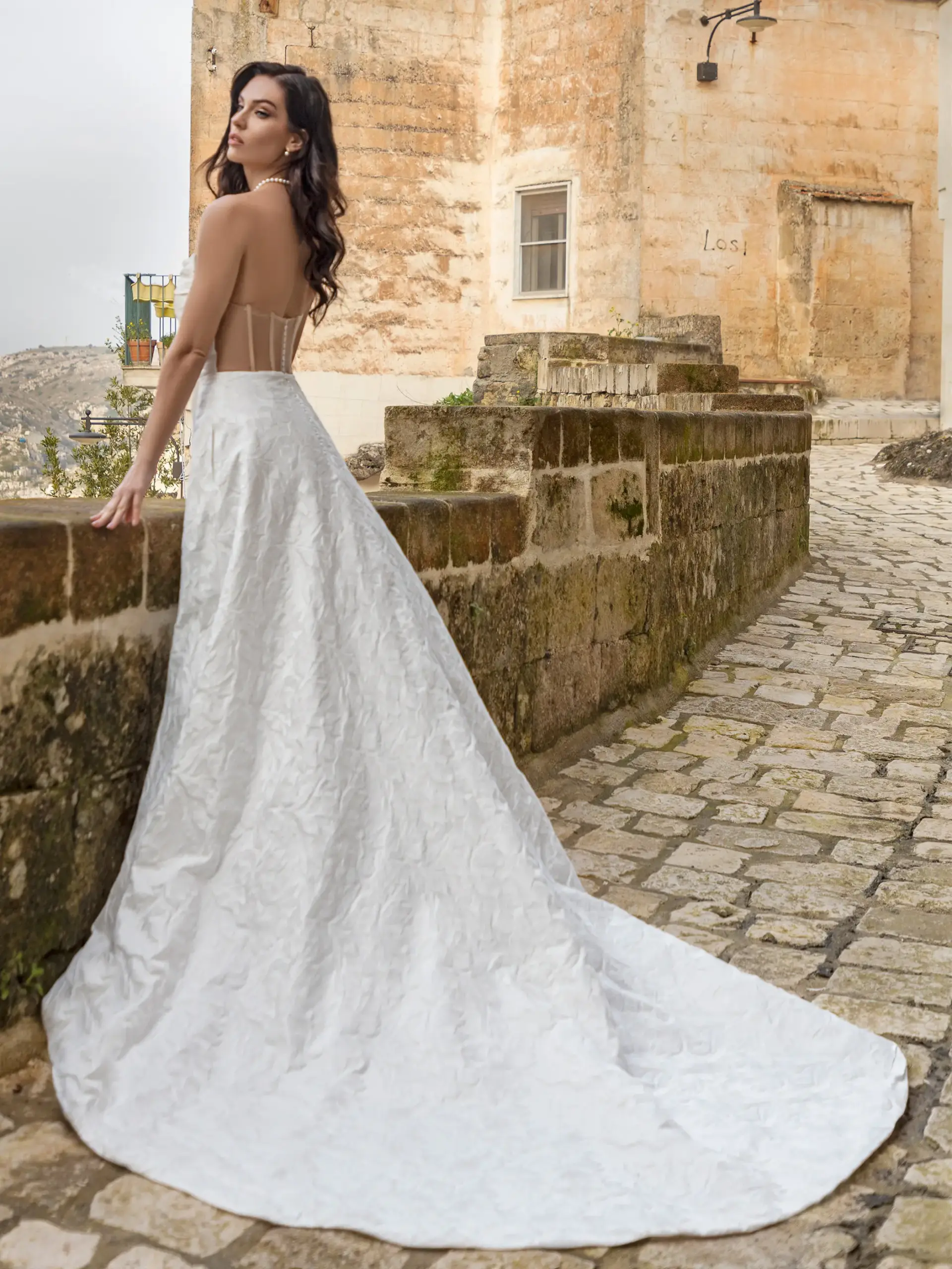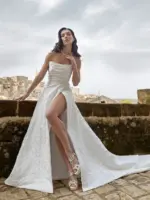 Abito linea A in raso damascato con corpetto scollo a barca e gonna con spacco