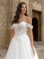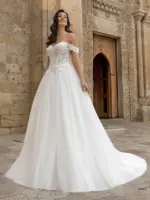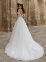 Abito romantico in pizzo chantilly e tulle glitter corpetto omerale stringato dietro