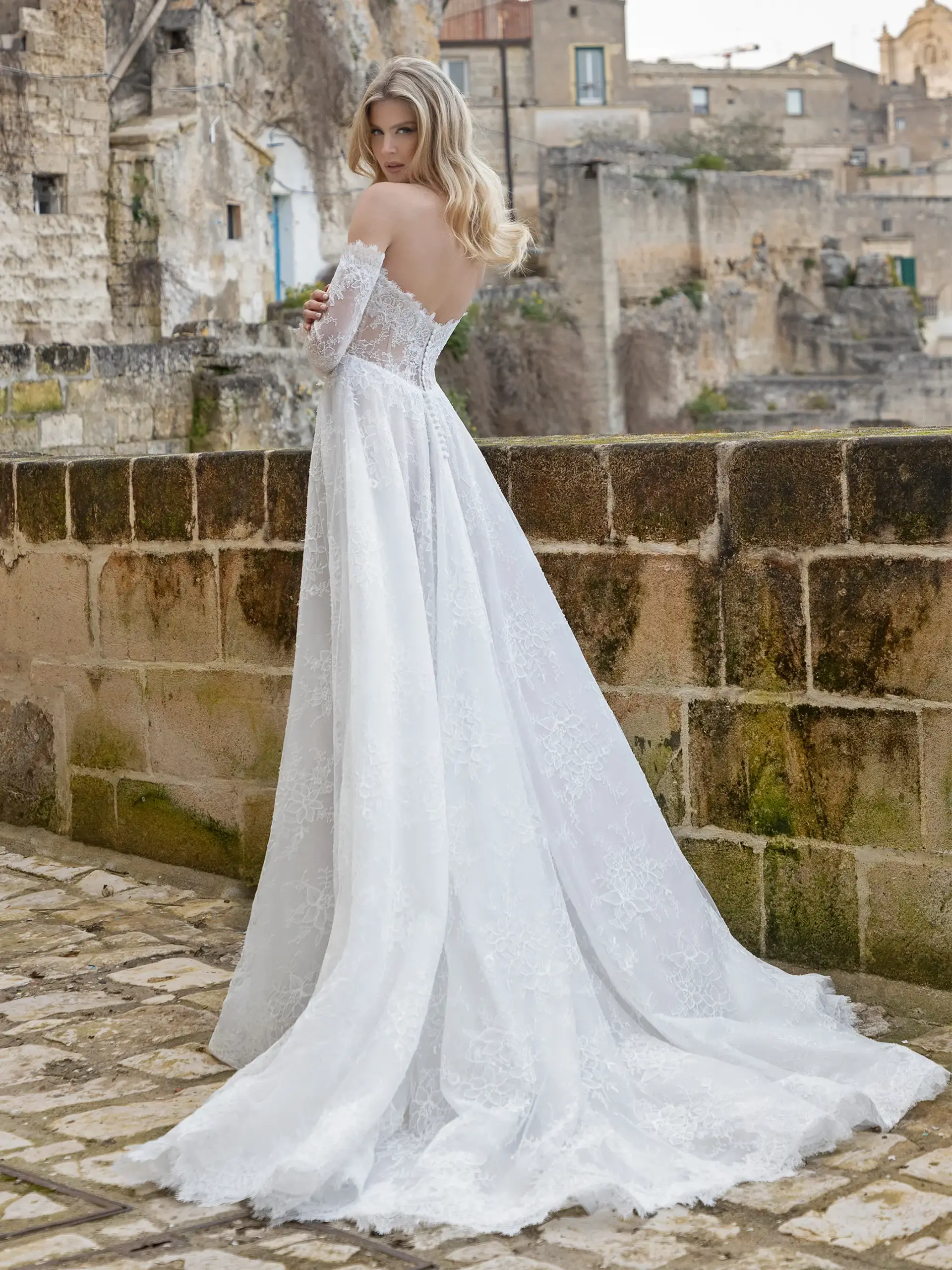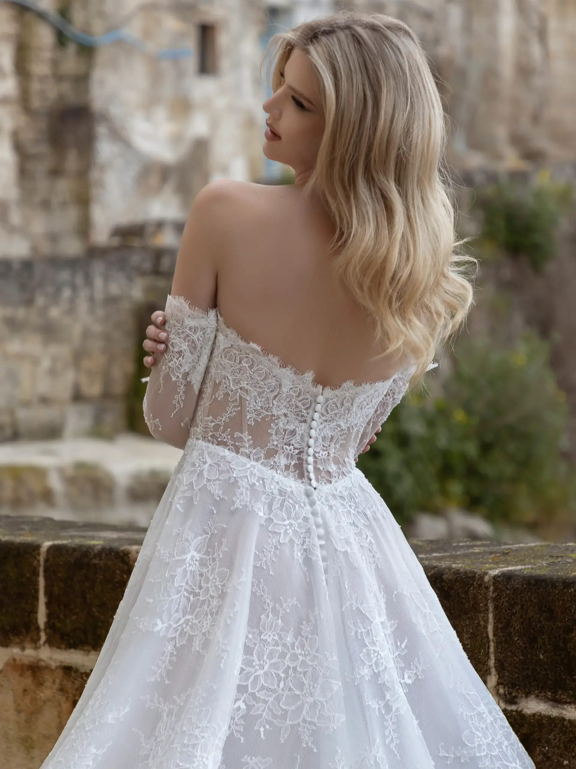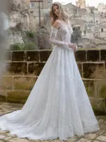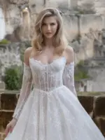 Abito linea A in pizzo Chantilly con bustino stecche in pizzo e gonna in tulle e glitter