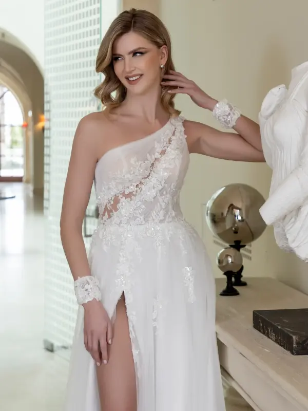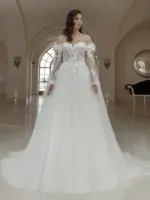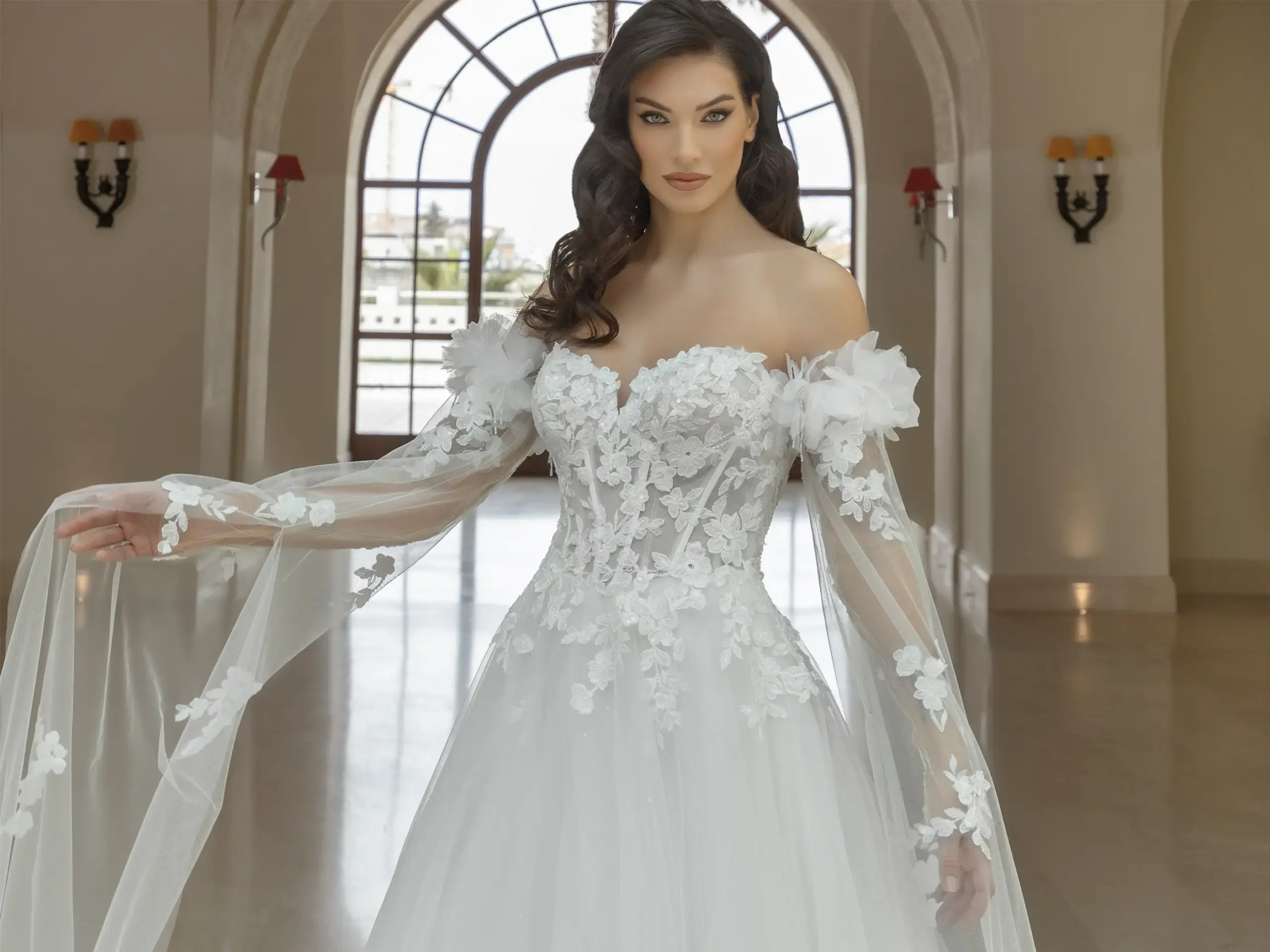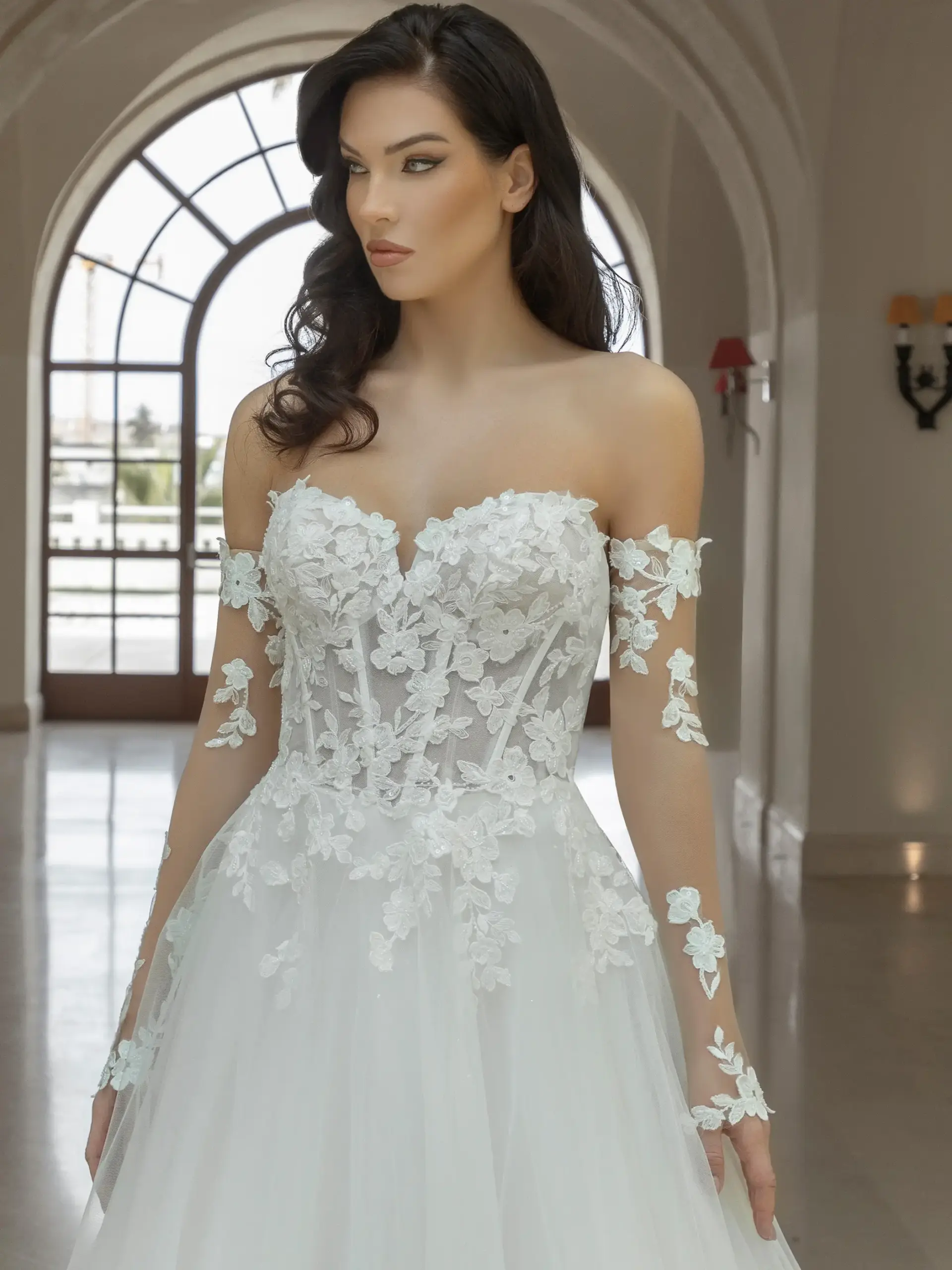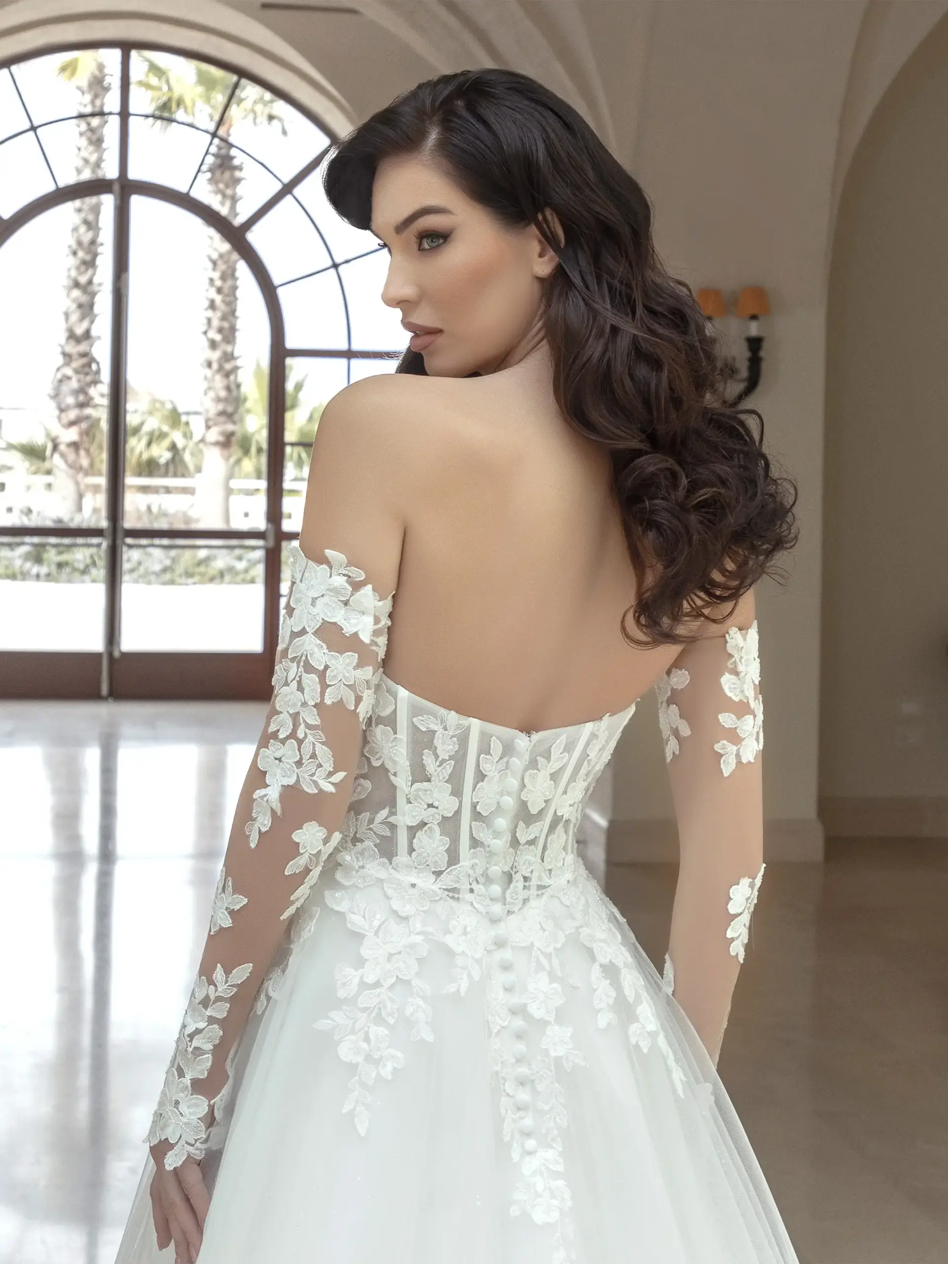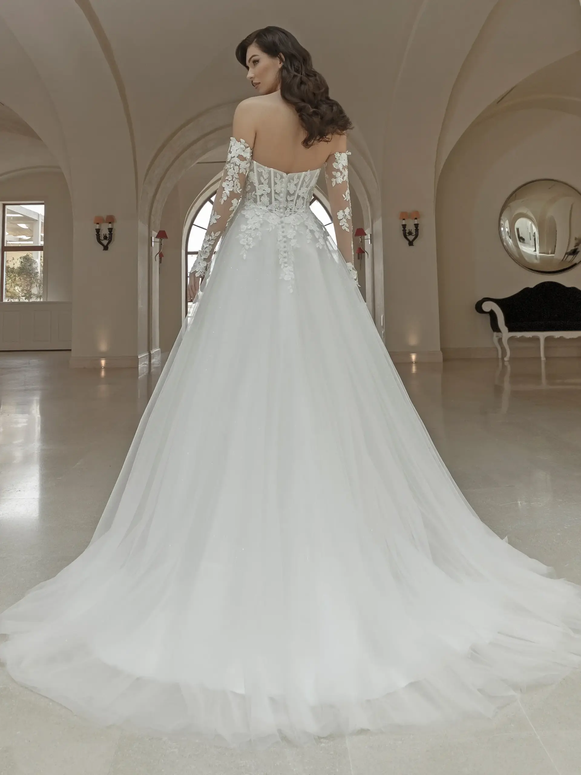 Abito romantico linea A corpetto cuore in pizzo e manicotti lunghi fino a terra gonna in tulle e glitter