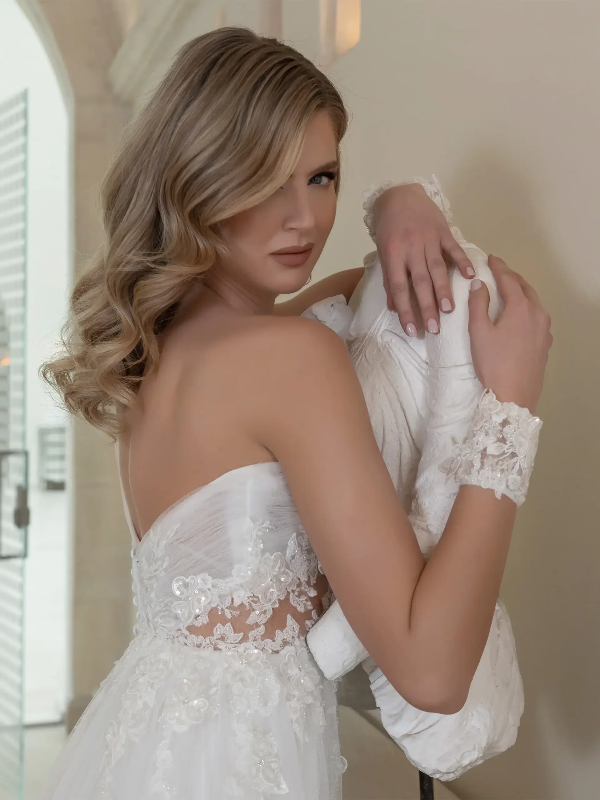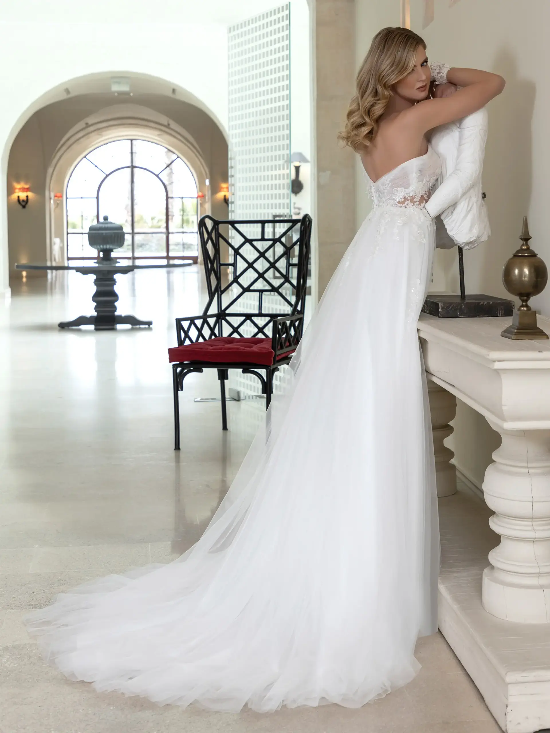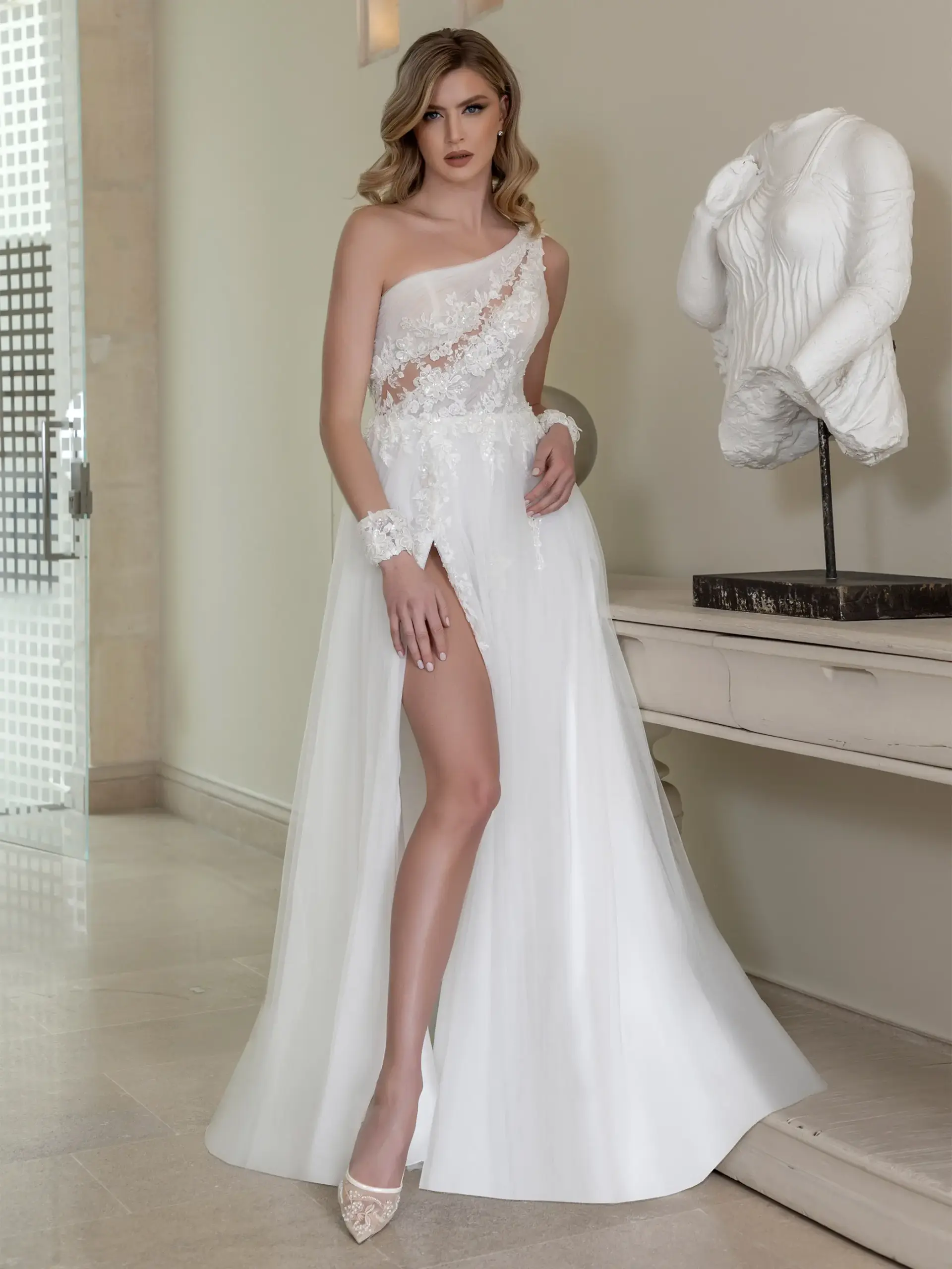 Abito linea A monospalla corpetto in pizzo ricamato e gonna in tulle ricamato e polsini
