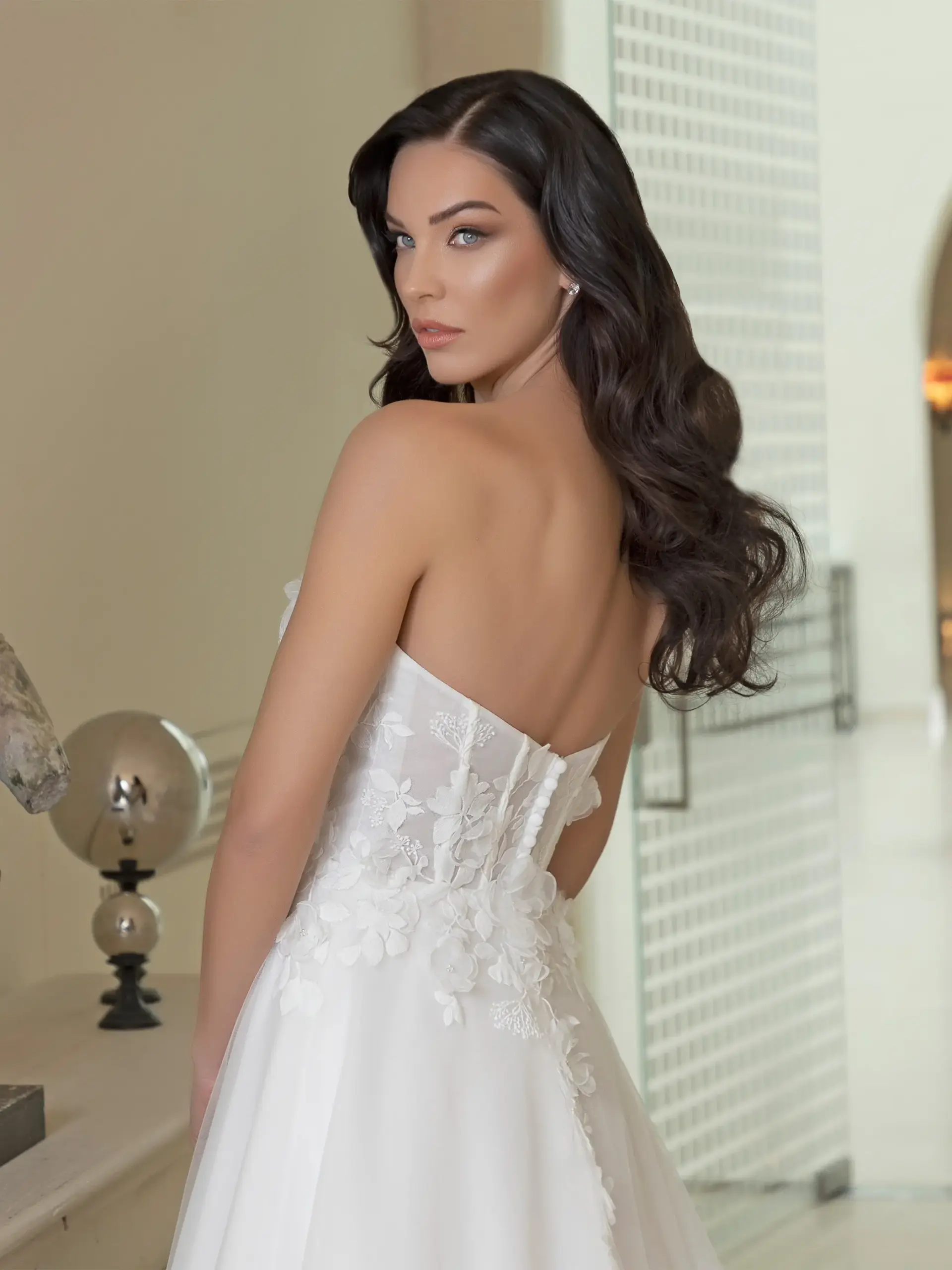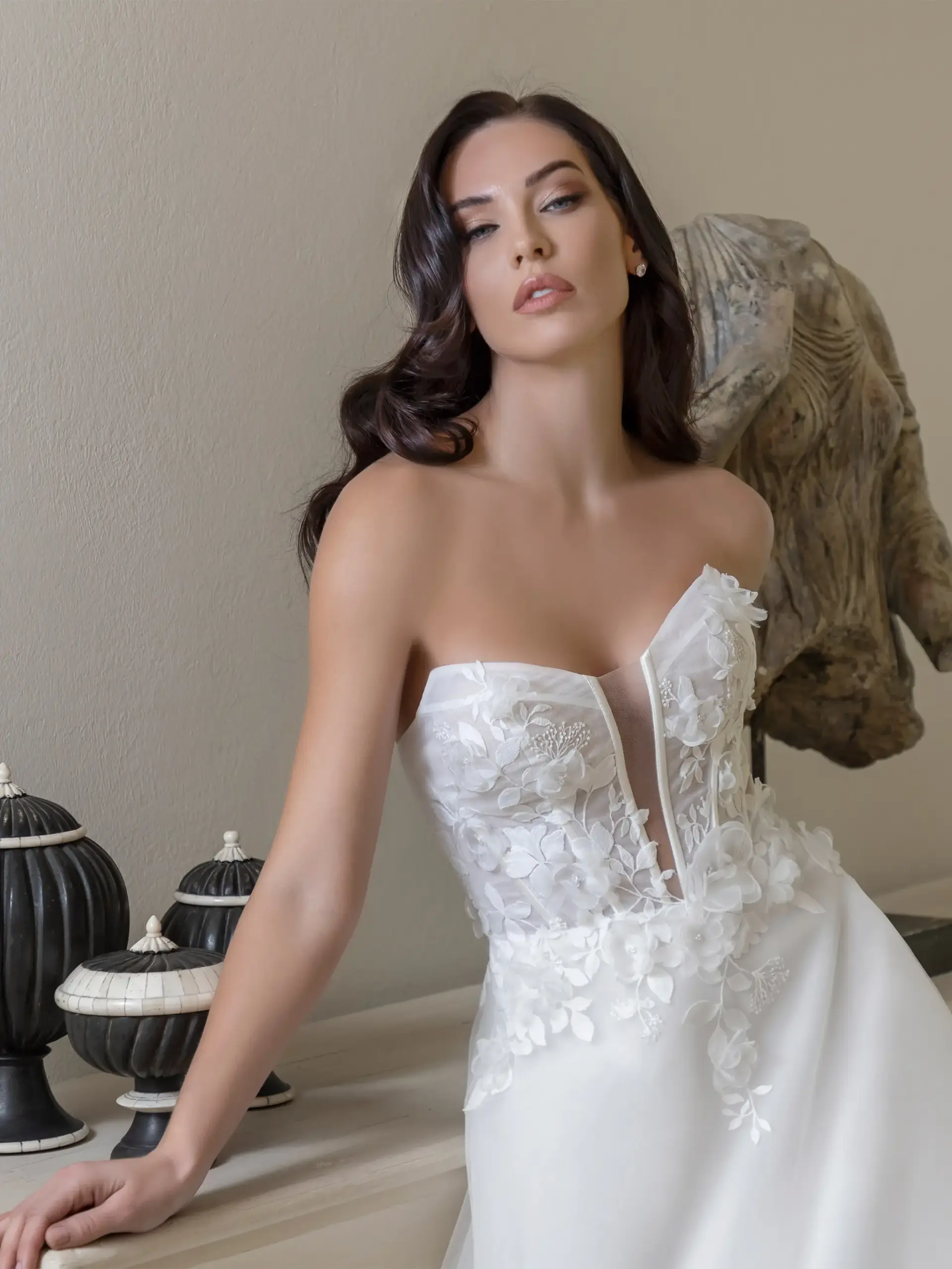 Abito in pizzo ricamato e tulle corpetto ricamato con scollatura a v