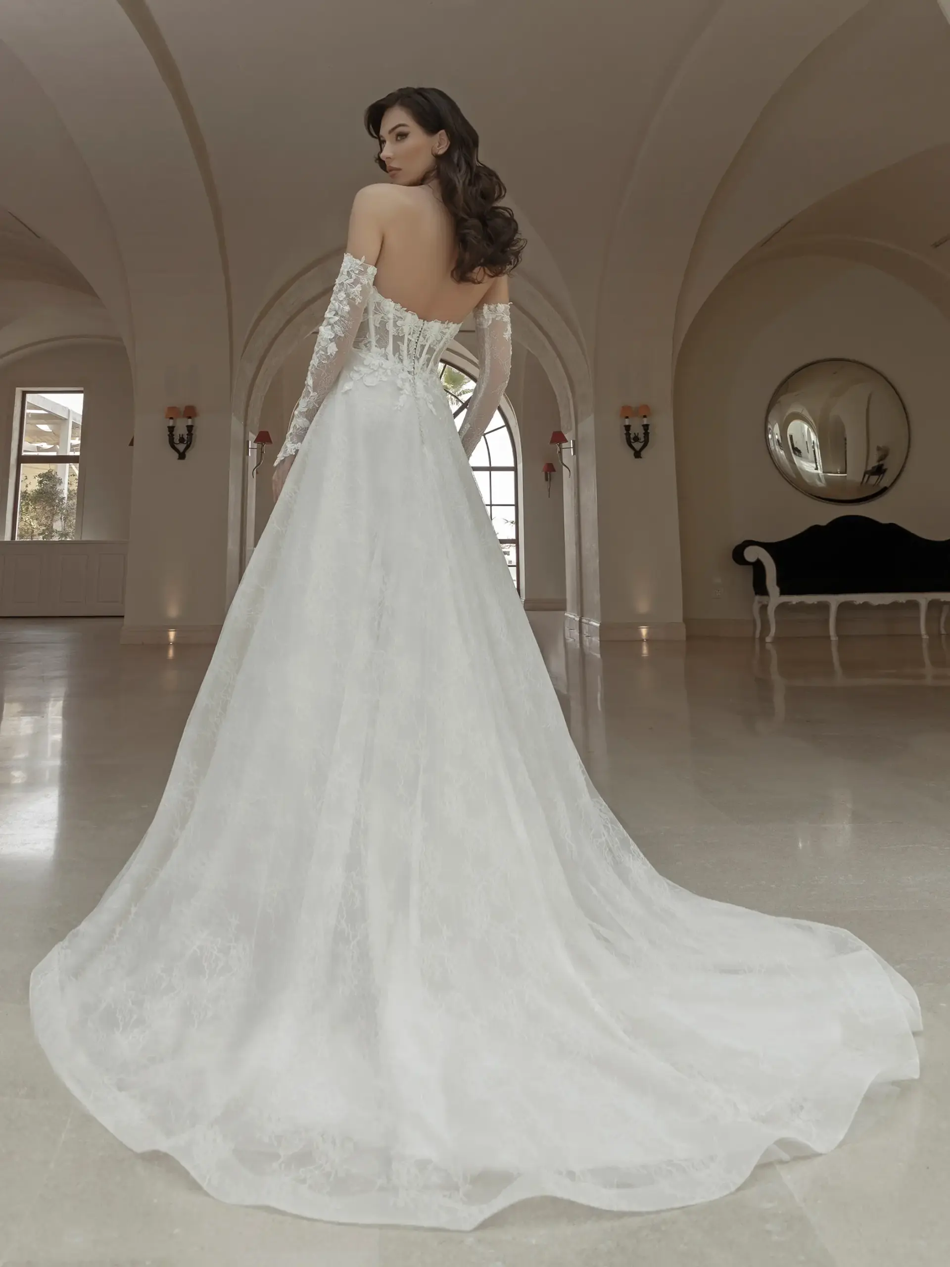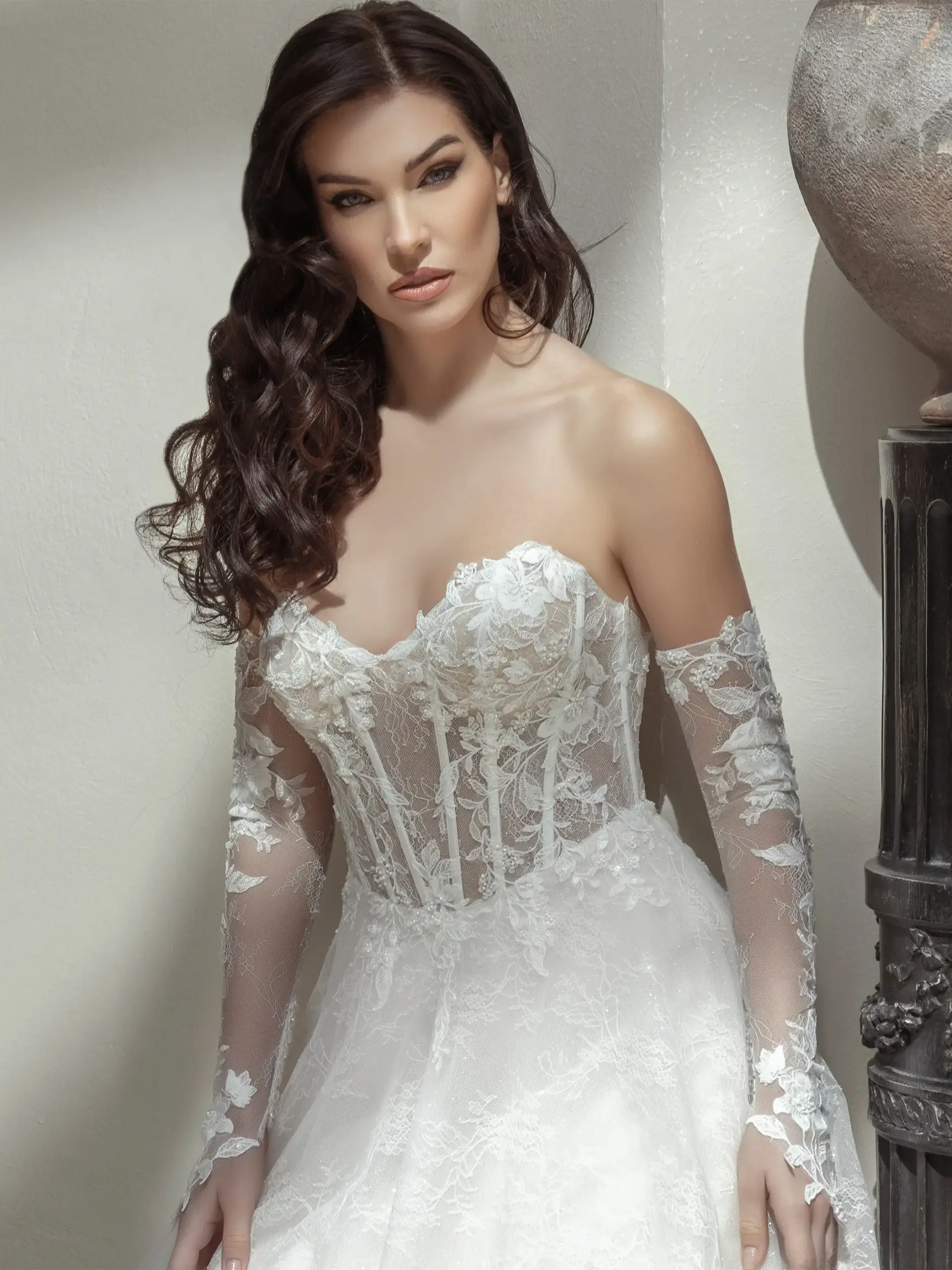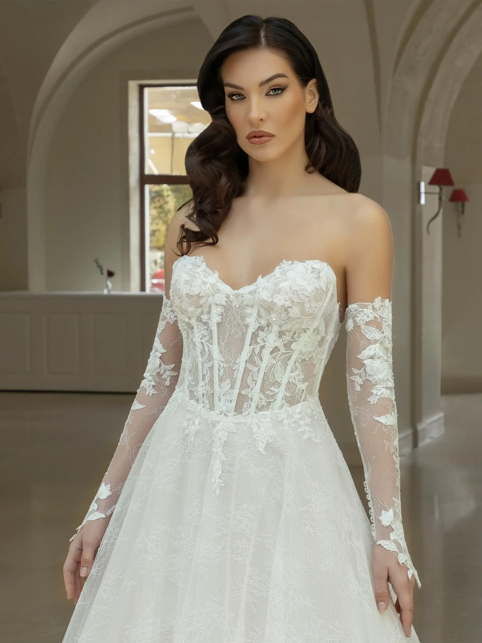 Linea A con manicotti corpetto con stecche a cuore in pizzo Chantilly