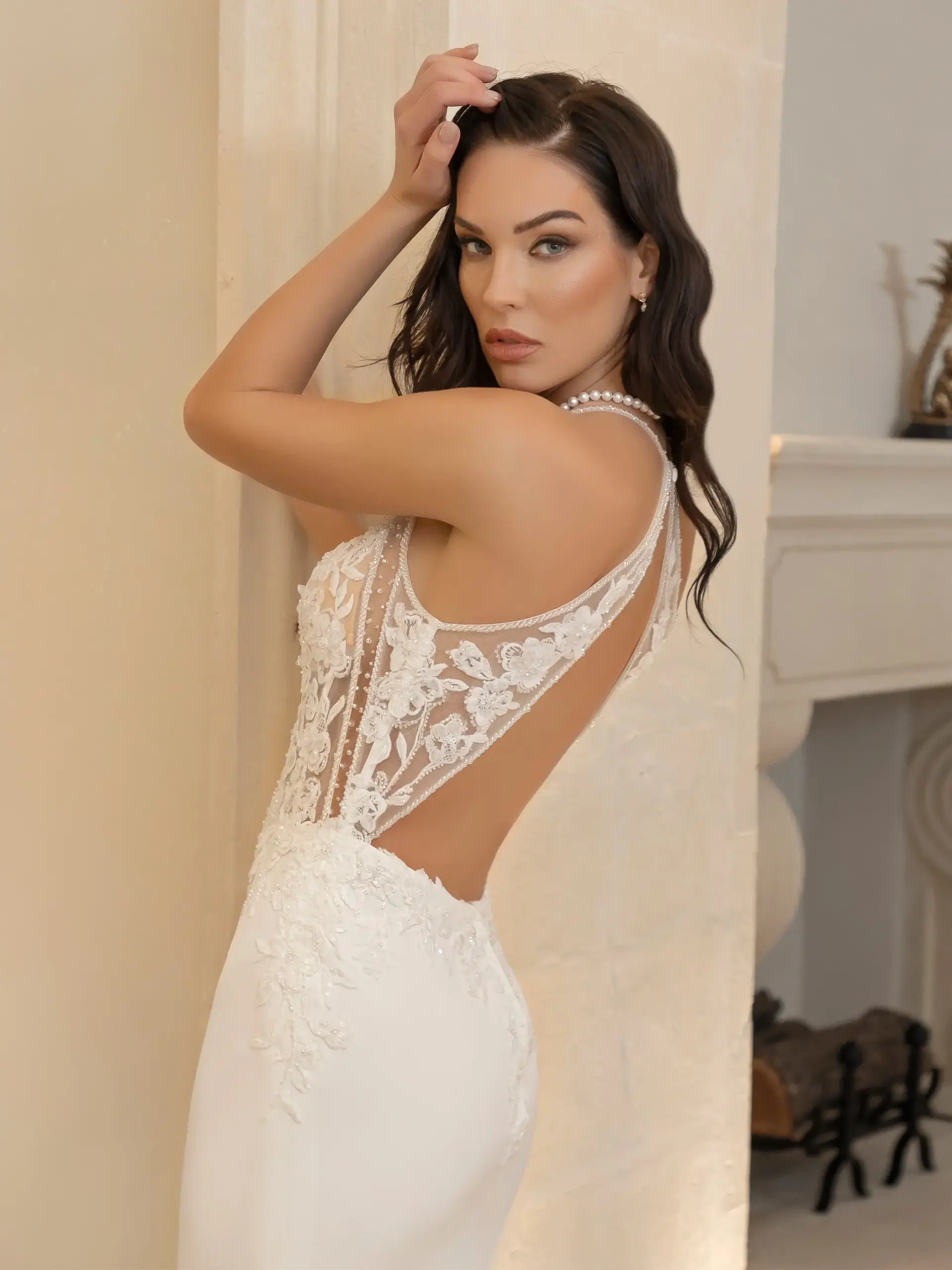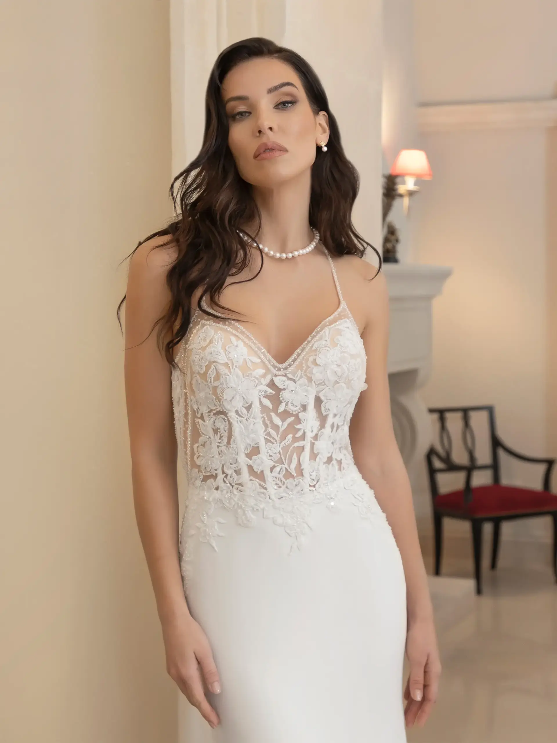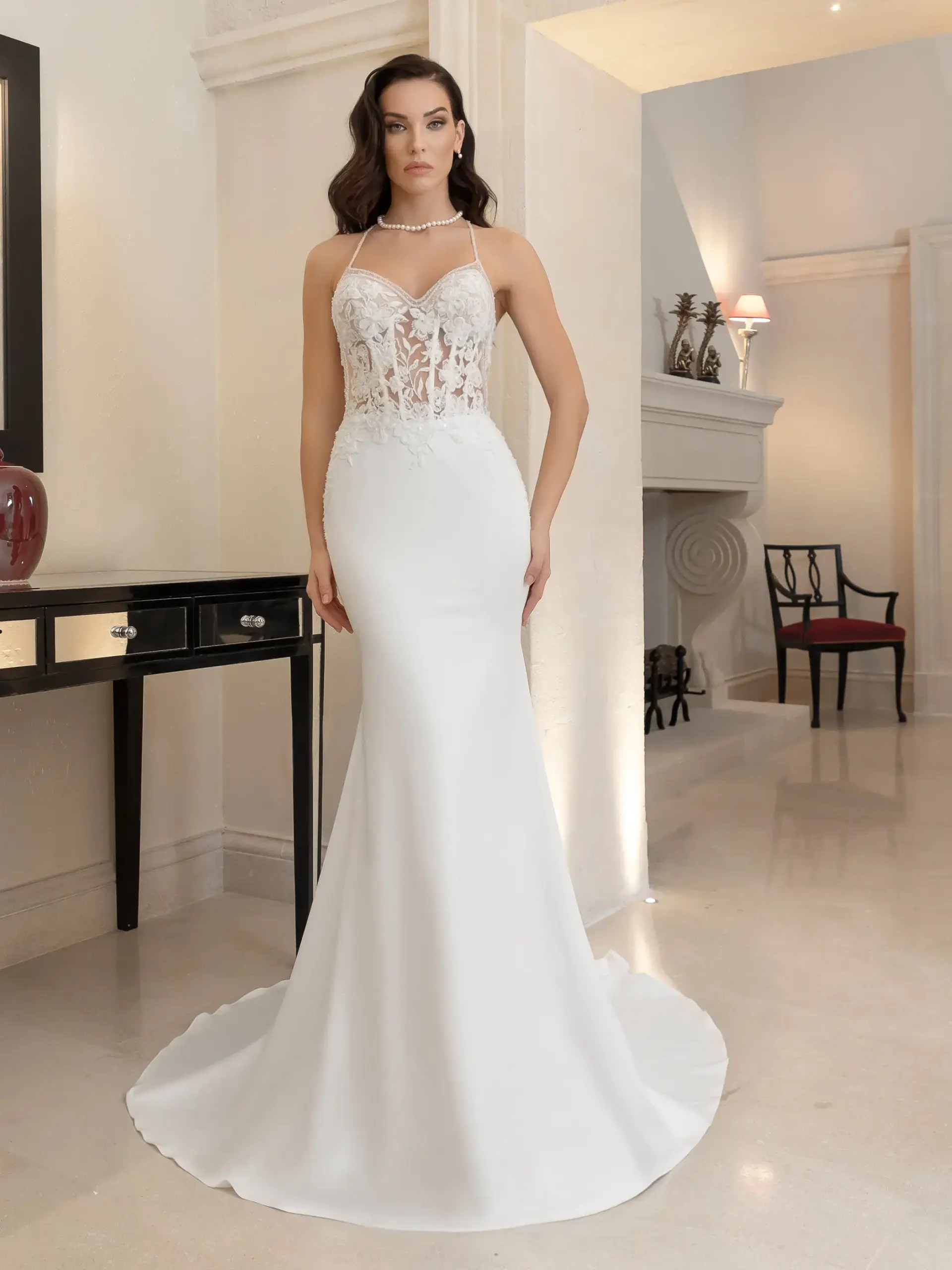 Abito a sirena in raso elasticizzato con corpetto in pizzo scollatura cuore Color nude