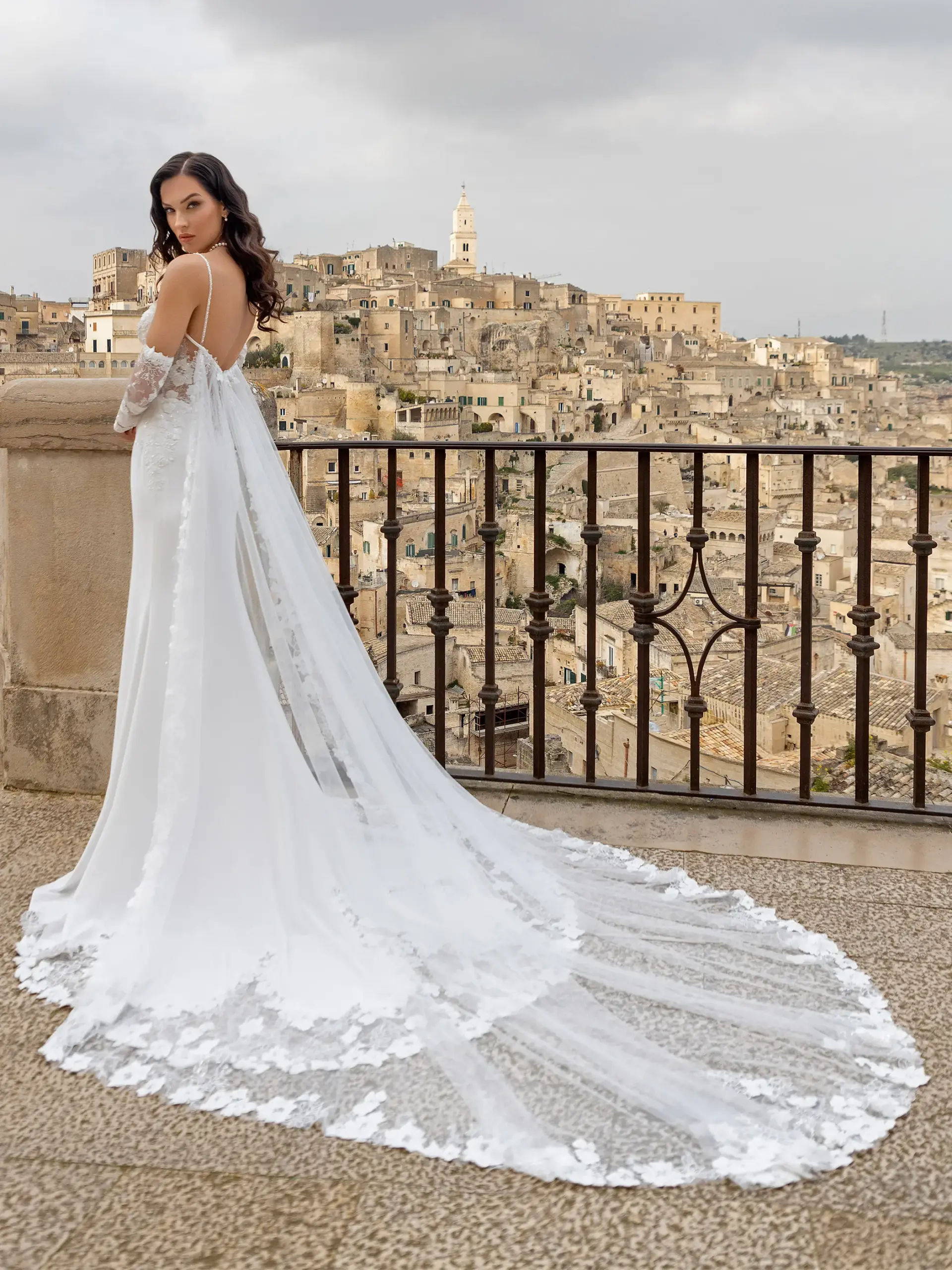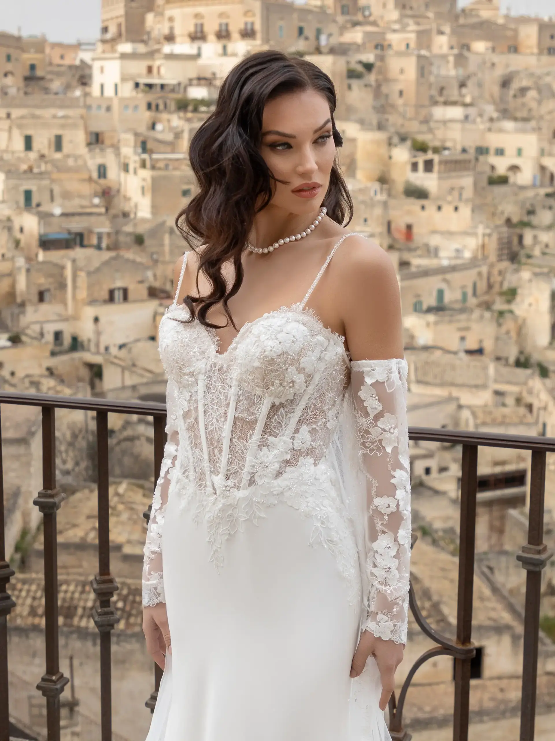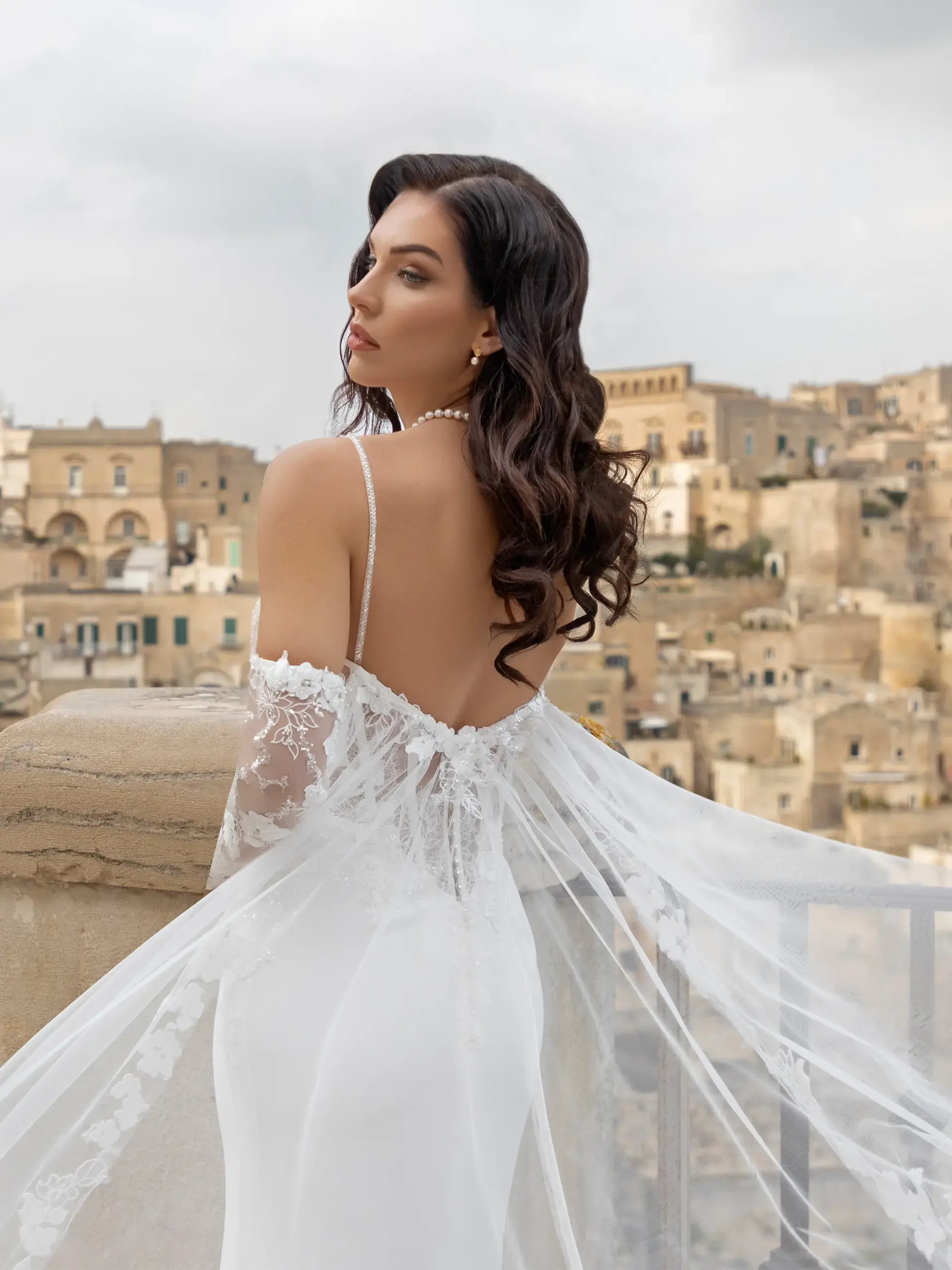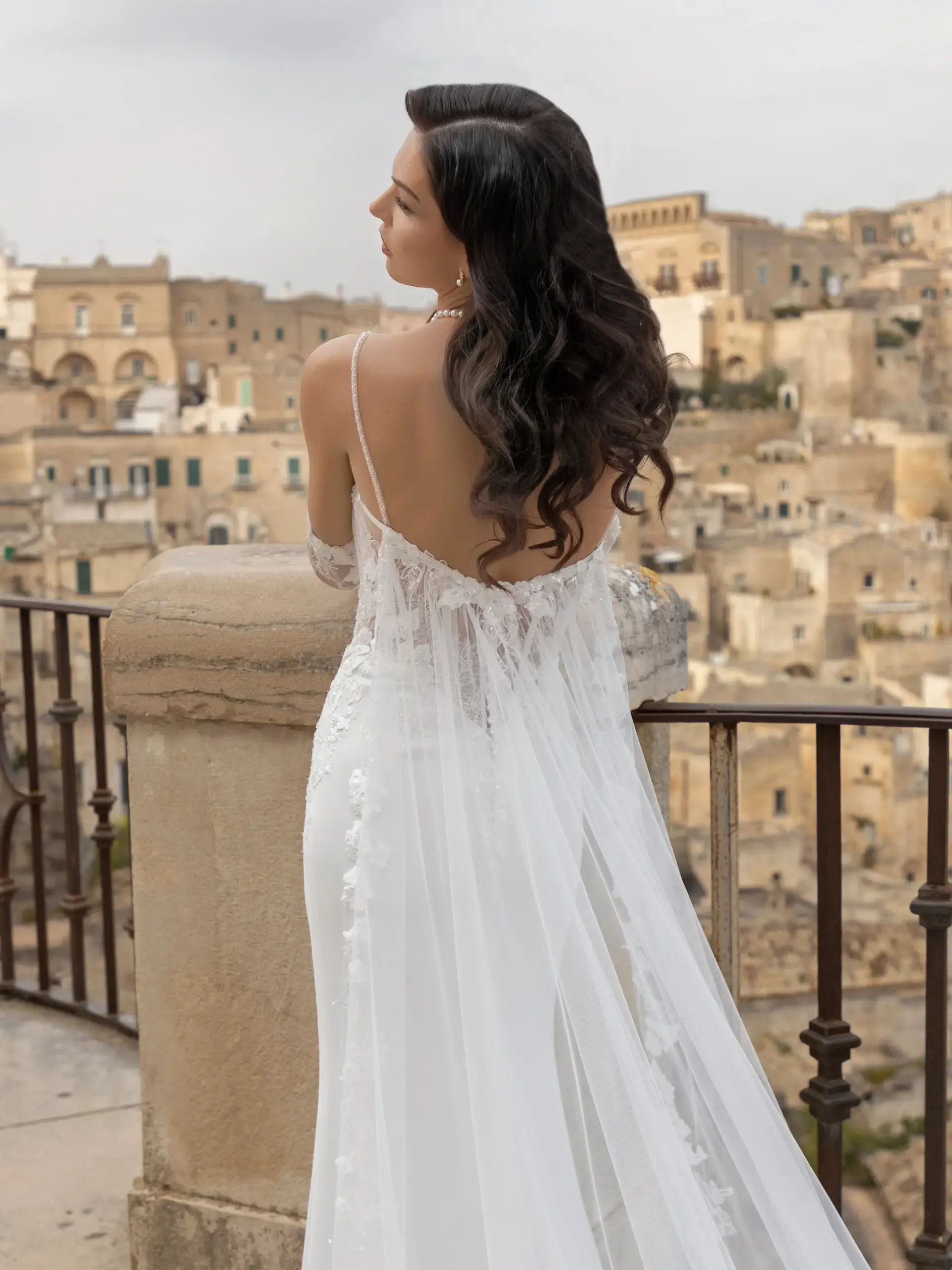 Abito asirena pizzo Chantilly scollatura cuore con mantello e manicotti