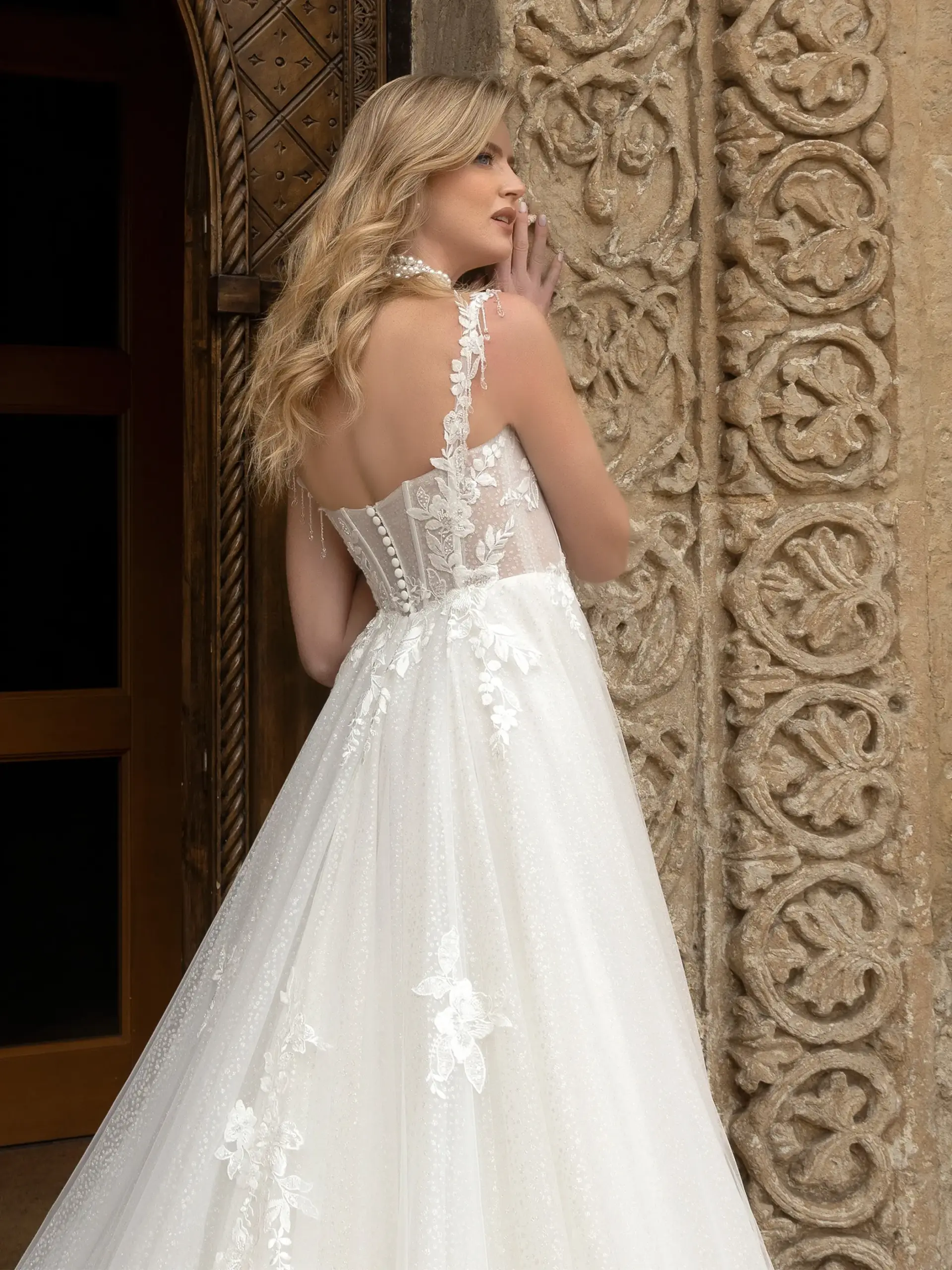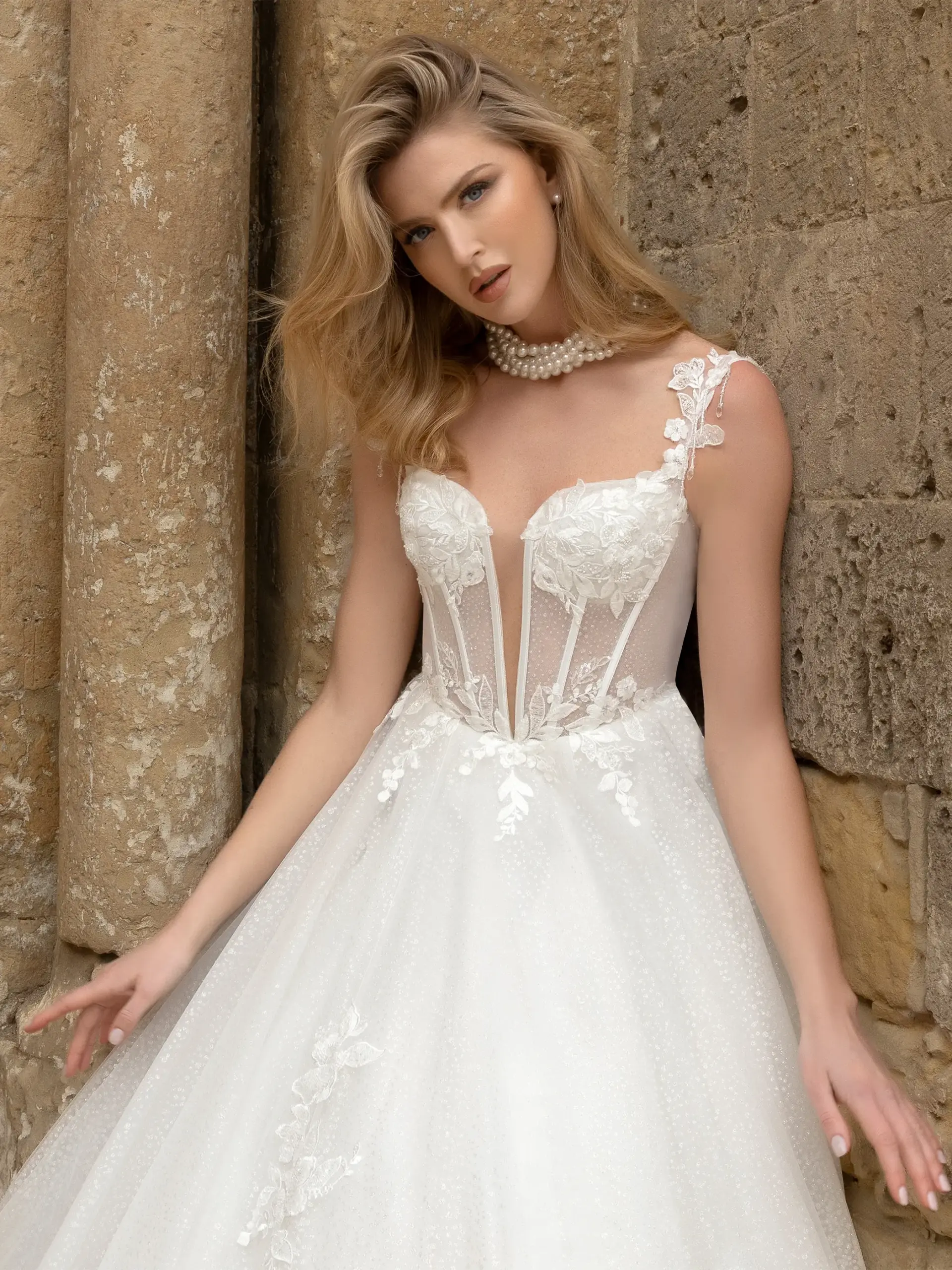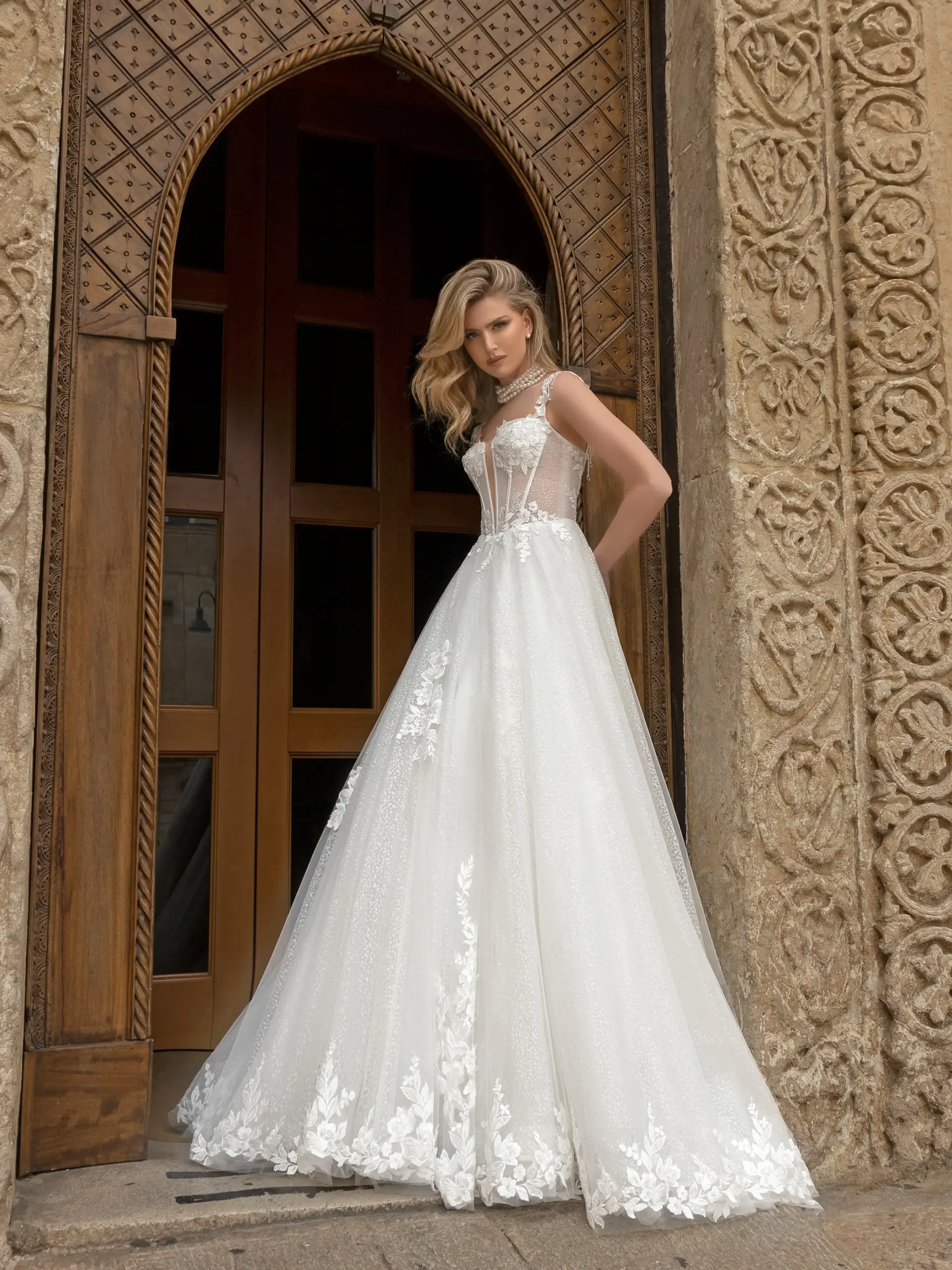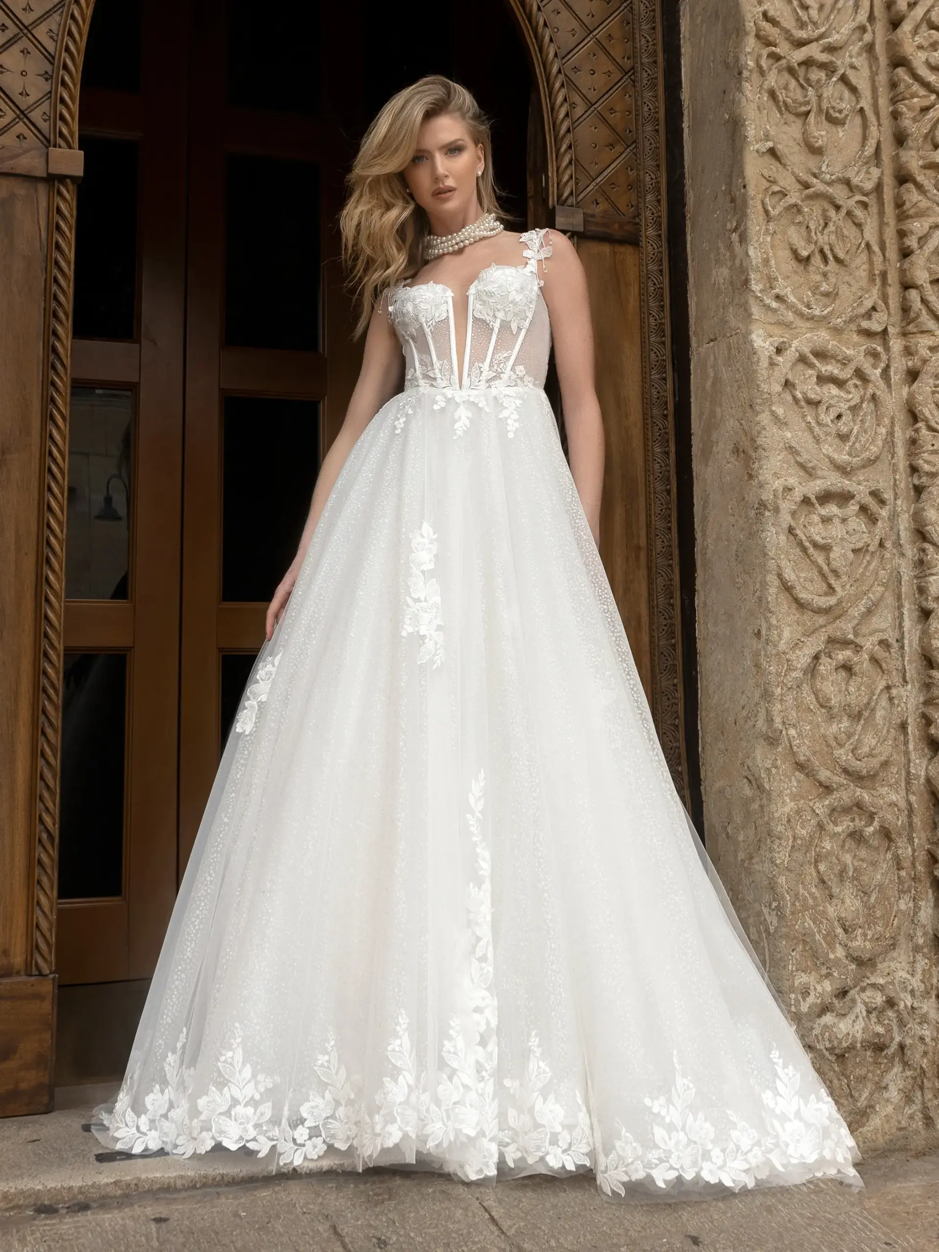 Abito romantico scollatura a cuore in pizzo tulle e glitter