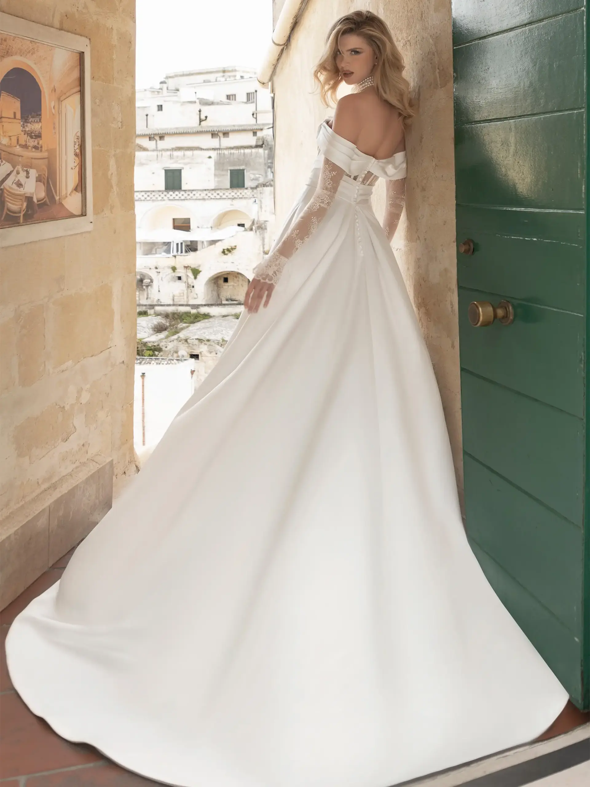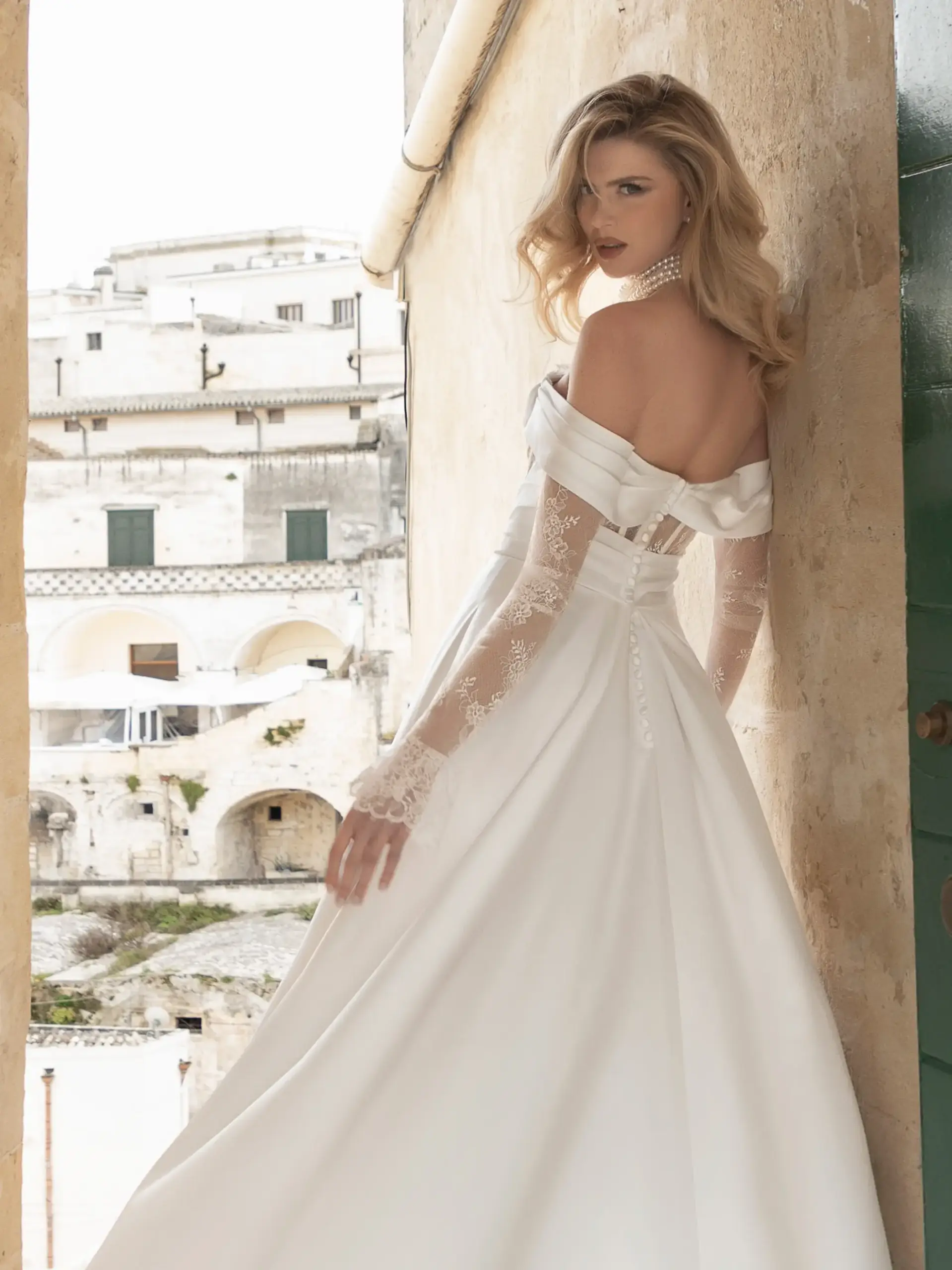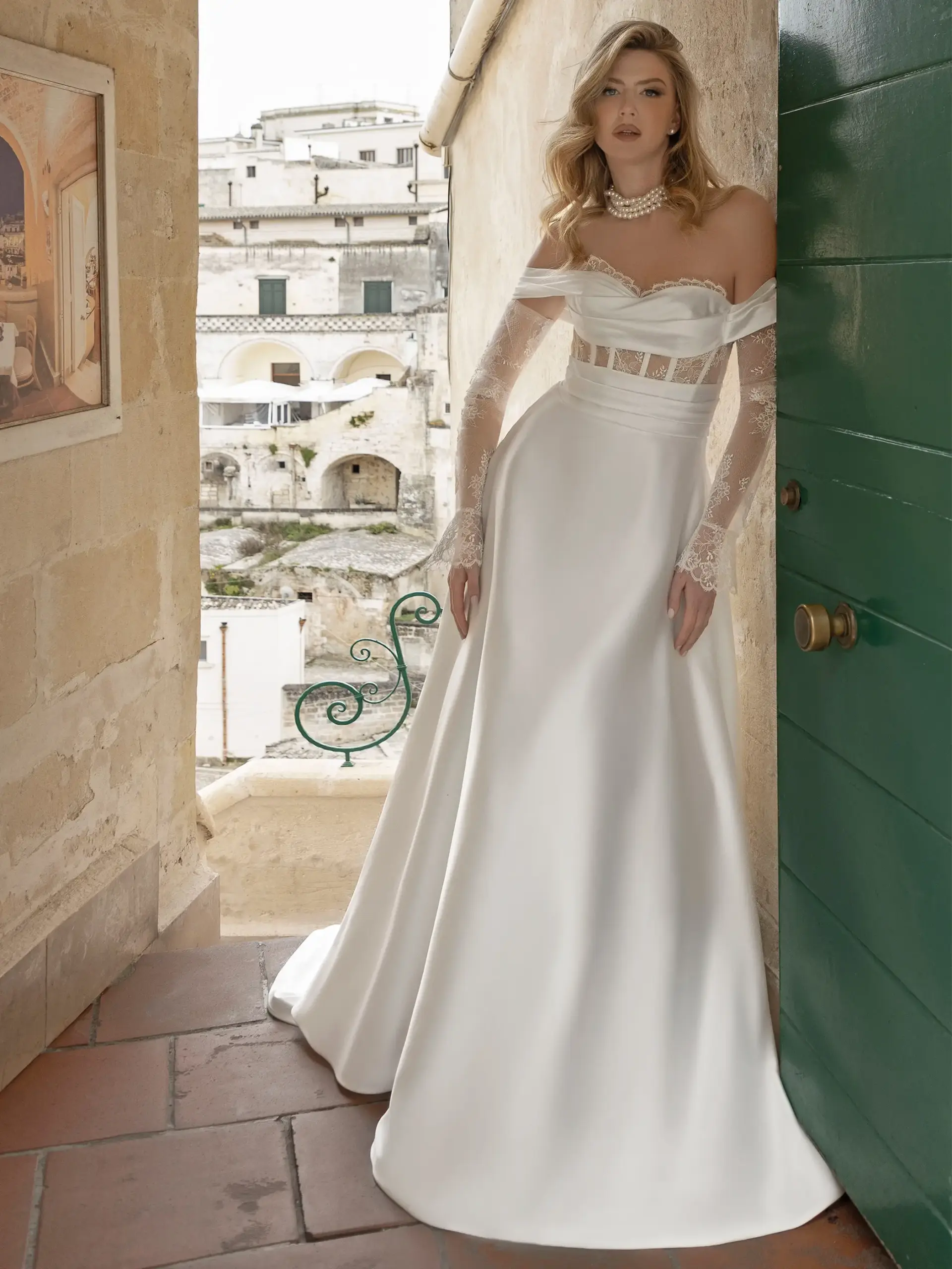 Abito linea A in pizzo Chantilly e raso elasticizzato con scollatura omerale